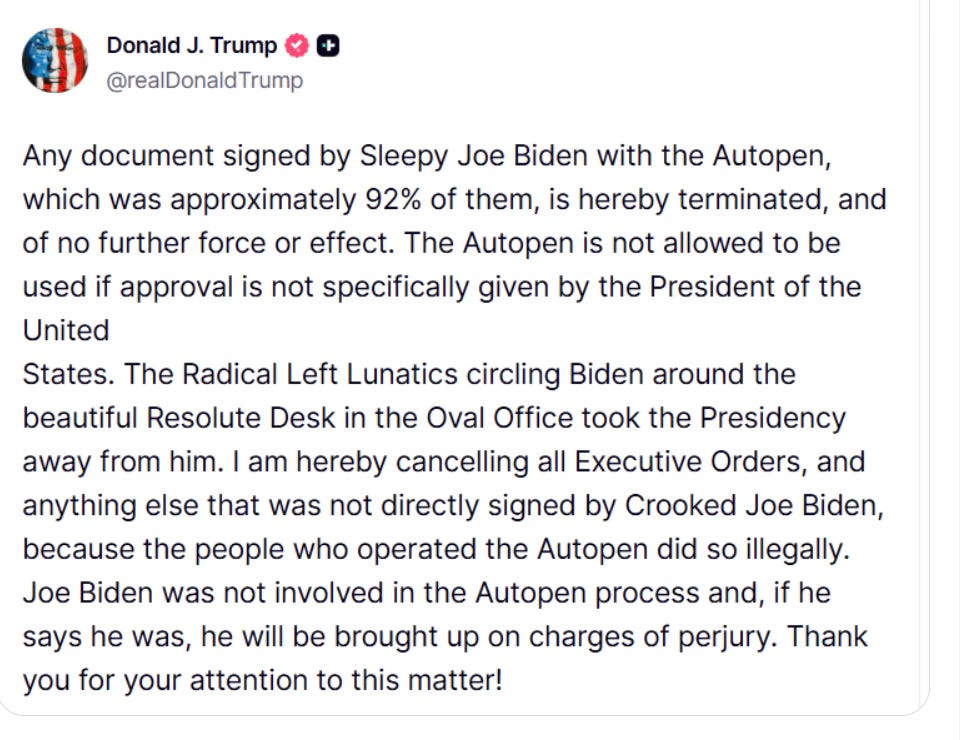 It sounds good but how does this turn from a thumping social media post to an actual legal order? Legal experts have rightly pointed out that, although a president has the authority to revoke executive orders, statements on social media carry no legal weight, and presidential pardons are constitutionally irreversible.
