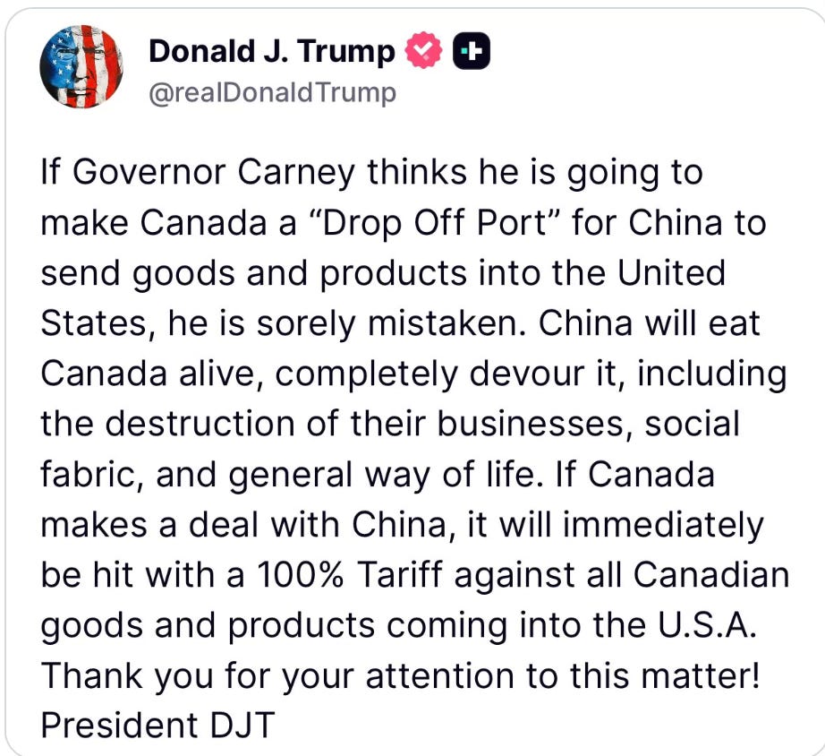 Komrade Karney is playing his best Marxist poker by framing us as being oppressed by the Bad Orange Man. This will enflame his Elbownian masses to again hate the Americans. True to form, President Trump responds. A leaked defense document pretends to frame a strategy to resist an American invasion using guerrilla tactics by regular citizens. Lol. Feelings are that Karney will call a spring election. He has provided an enemy and a solution. Trade and strategic alliance with Islamo/Communists will be the focus for prosperity. He has to move fast as election rigging in the past is on the horizon of being exposed after Maduros arrest. He's going to talk and they all know it. Looking forward to Make Britain Great Again rally in May. Watching in Kanadastan.