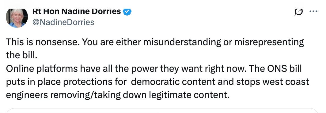 I think it can be seen as both. This is the Boris wing of the Conservative Party now folding into Reform. Jenkyns and Nads were Boris devotees and when he fell they floated away. Reform is a convenient vehicle for them. Dorries has interesting form. Here she is in 2022 praising the Orwellian Online Safety Act.