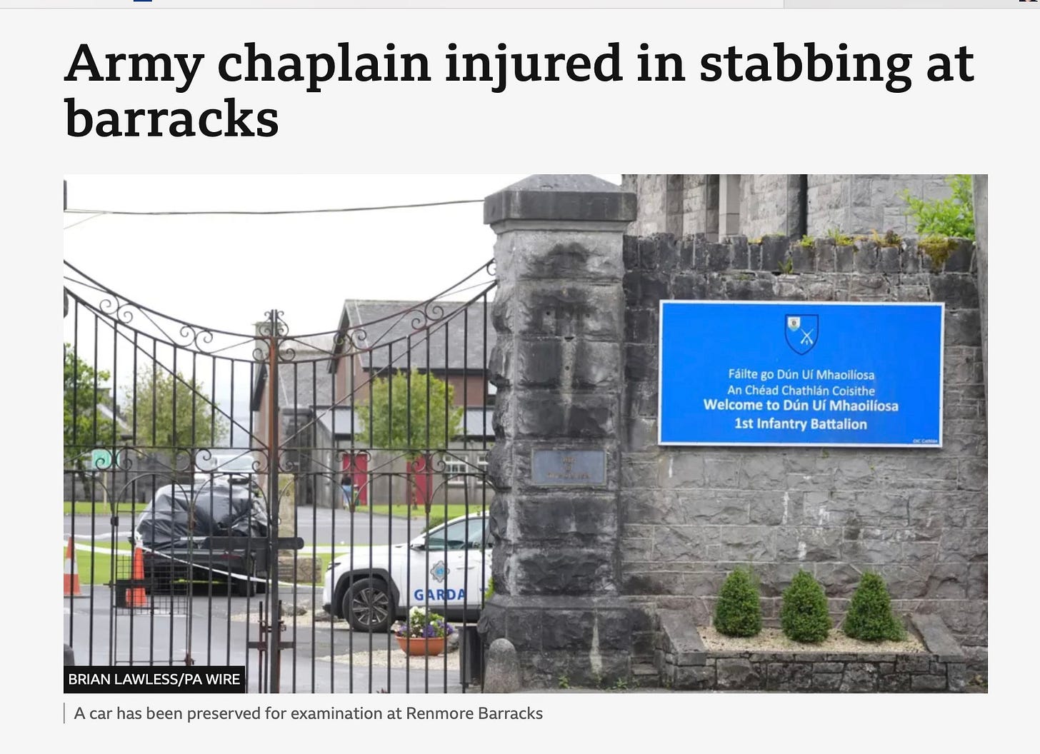 Terrorism is a line of inquiry after an army chaplain was stabbed in Ireland, police have confirmed. A teenage boy was arrested after Thursday night's attack outside Renmore barracks in Co Galway.
