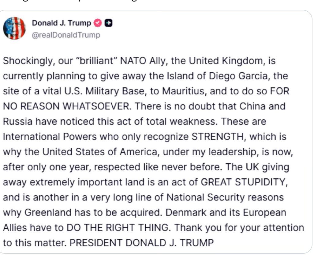 I hope Trump does escalate this further. And yes, the Chagossians have been treated deplorably. But Starmer, bowing to every bit of bad advice from his globalist counterpart, Lord Hermer, doesn't give a hoot about anyone, least of all his own people. Let's see Starmer squirm a bit more. He deserves it.