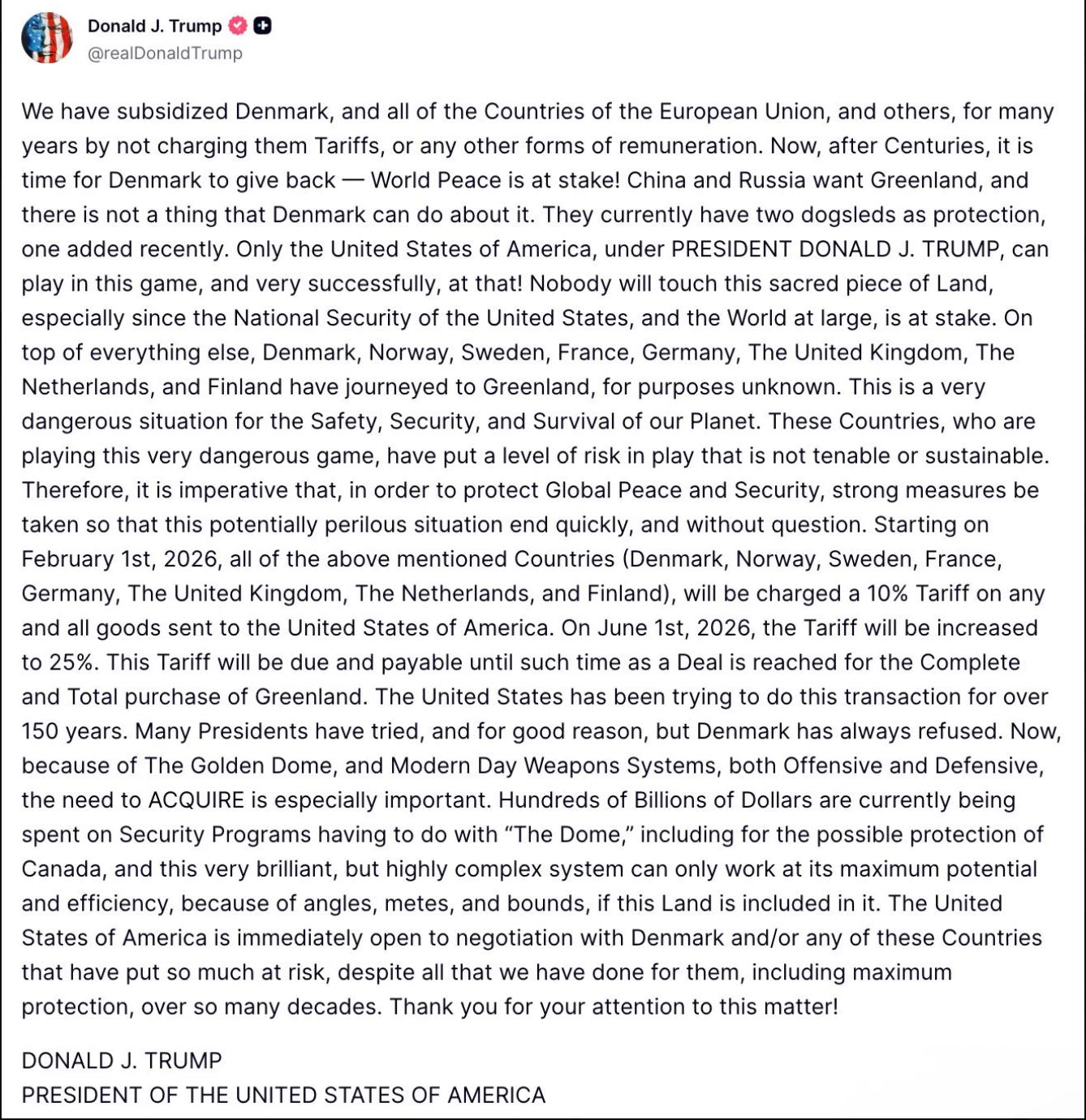 This was Trump’s blistering reaction to the unbelievable inept deployment of troops from most of these countries to Greenland this past week. In essence, they f*cked about and now they have found out! The UK finds itself also caught in this situation having sent ONE military officer there. What were they thinking? Could they not see how ridiculous it all looked and how insulting it was towards the President?