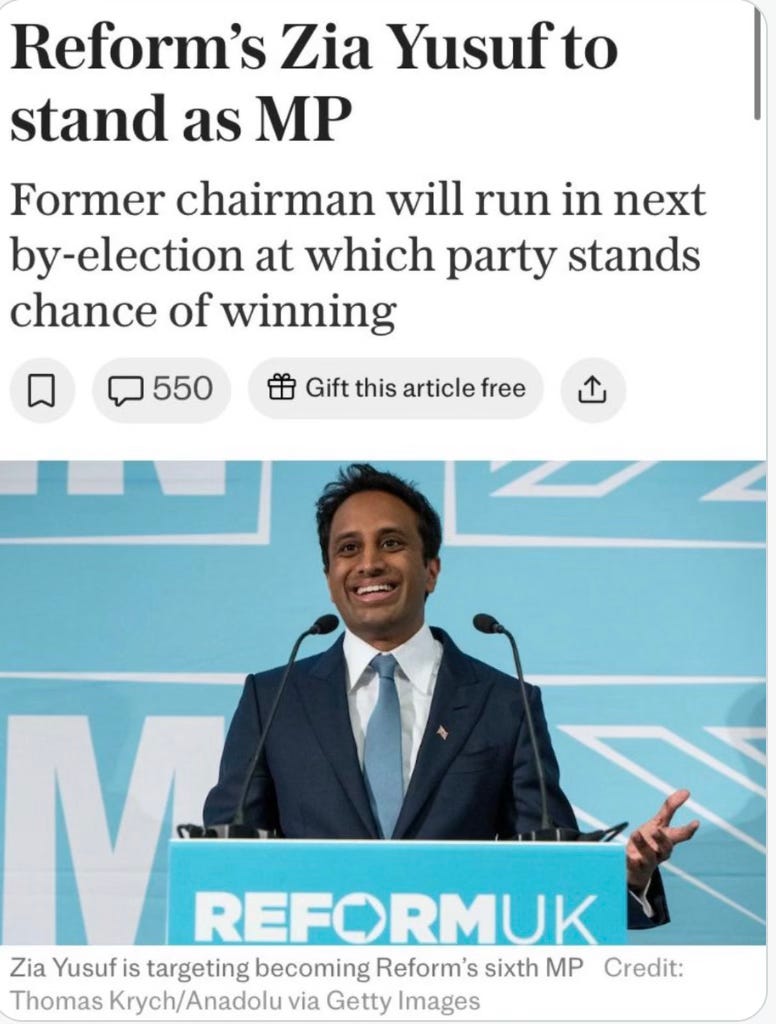 Let’s cut straight to the chase. Former Reform Chairman and newly anointed Reform DOGE supremo Zia Yusuf has said that he is next in line to stand for a “winnable” Westminster seat.